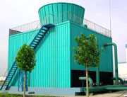 (7)吸聲設(shè)施:超低噪聲型冷卻塔在上塔體出風(fēng)口上面安裝了帶吸聲材料的屏蔽及吸聲柵,降低了風(fēng)機(jī)及電機(jī)的噪聲。對(duì)于小塔設(shè)蘑菇型吸聲柵。